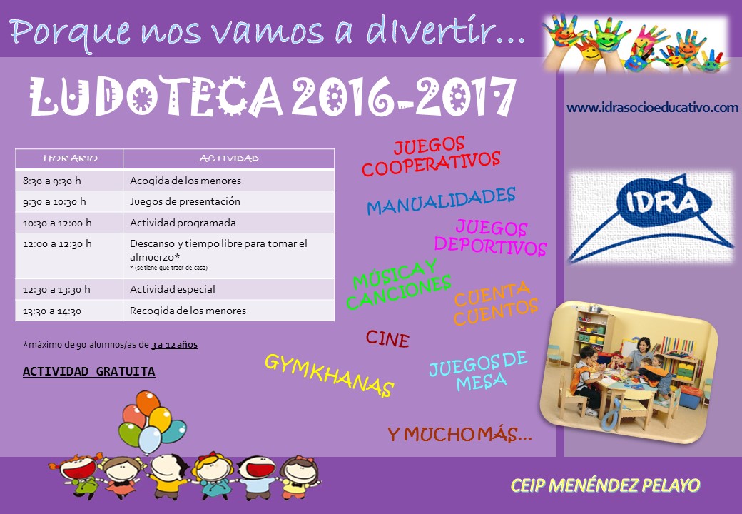 A partir del 1 de octubre el CEIP Menéndez Pelayo ofrece el servicio de ludoteca los sábados y días no-lectivos. Se puede descargar un fichero con los detalles. Empieza este sábado y los niños pueden venir sin inscripción de 8,30h a 9,30h. Rellenarán una pequeña ficha el primer día que acudan.