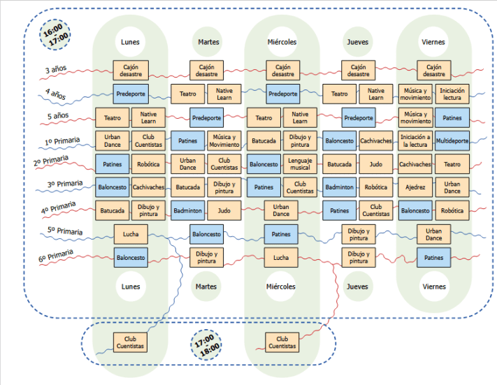 - Para primaria (dependiendo del curso y día de la semana): Baloncesto, Judo, Urban Dance, Dibujo, Teatro, Patinaje, Robótica y Multideporte.
