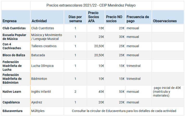 Para todas las actividades se indican dos precios, uno para familias socias y otro para no socias. Aquí tenéis un resumen: