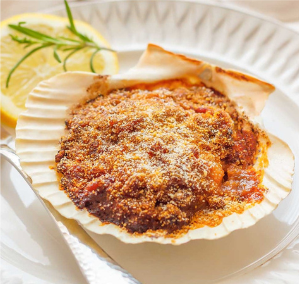 - La salsa resultante se deposita sobre la concha de la vieira y se añade pan rallado.