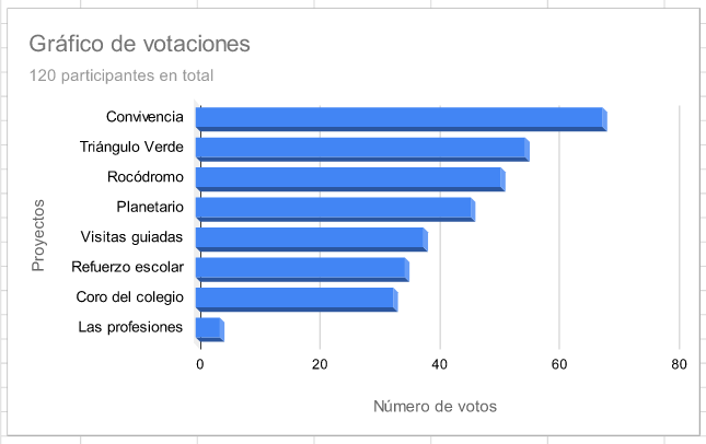 Dado que el presupuesto global es de 4.000€ para esta campaña de presupuestos participativos, la primera propuesta (Mejora de la Convivencia mediante la Educación Emocional) es la que entra dentro del presupuesto global. Resaltamos que ha obtenido el apoyo de más del 50% de socios/as que han participado en la votación. Aquí tenéis un gráfico resumen de las votaciones: