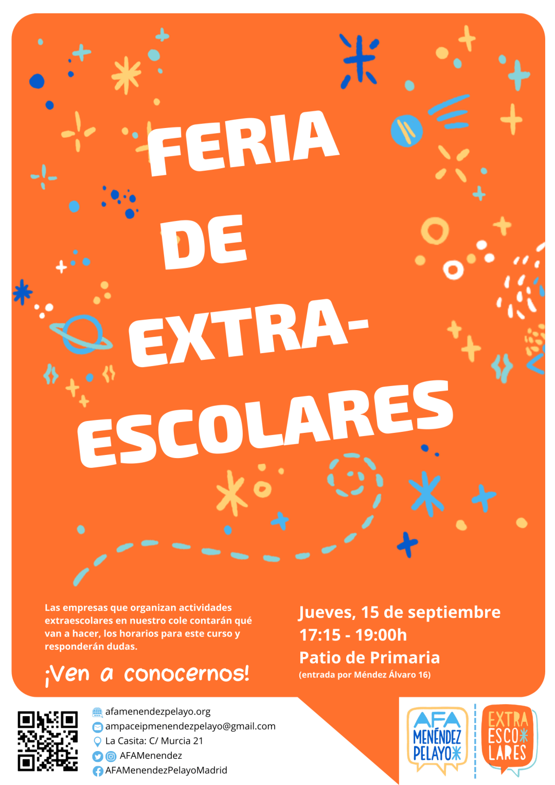 Este año retomamos las buenas costumbres prepandemia y vamos a celebrar nuestra clásica Feria de Extraescolares el próximo jueves 15 de septiembre.