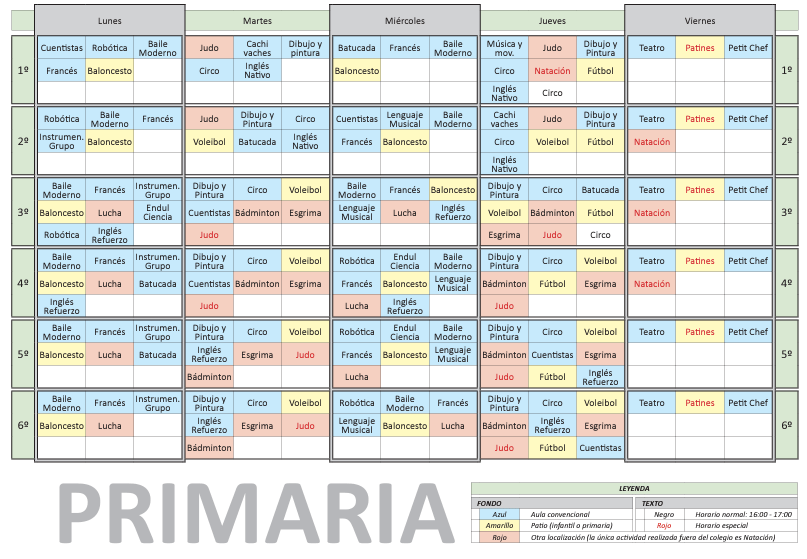 Nota: Las actividades de fondo azul se realizan en aulas del centro, las de fondo amarillo tienen lugar en el patio y las de fondo rojo en alguna otra localización dentro del colegio (salón de actos, gimnasio…). La única actividad que se organiza fuera del centro es Natación. En cuanto a los horarios, las actividades con texto en color negro tienen un horario de 16:00 a 17:00h. Las marcadas con texto rojo tienen un horario distinto y os aconsejamos que consultéis el dossier correspondiente para más detalle.