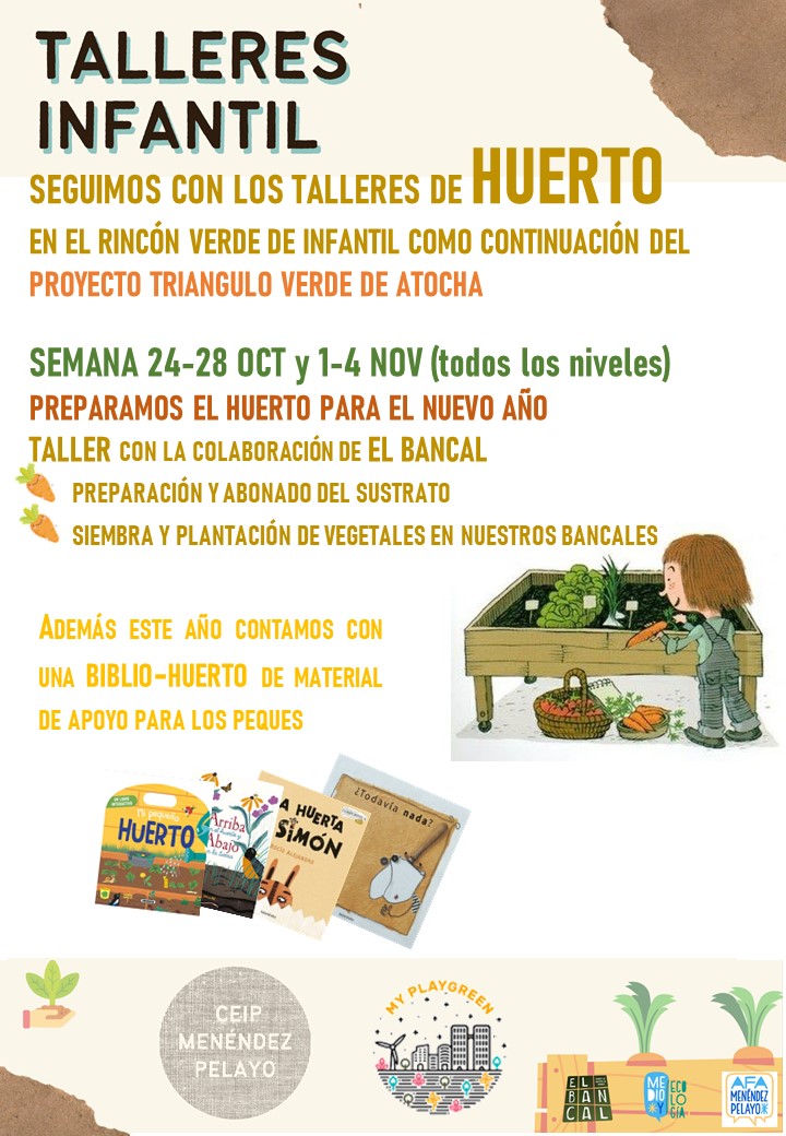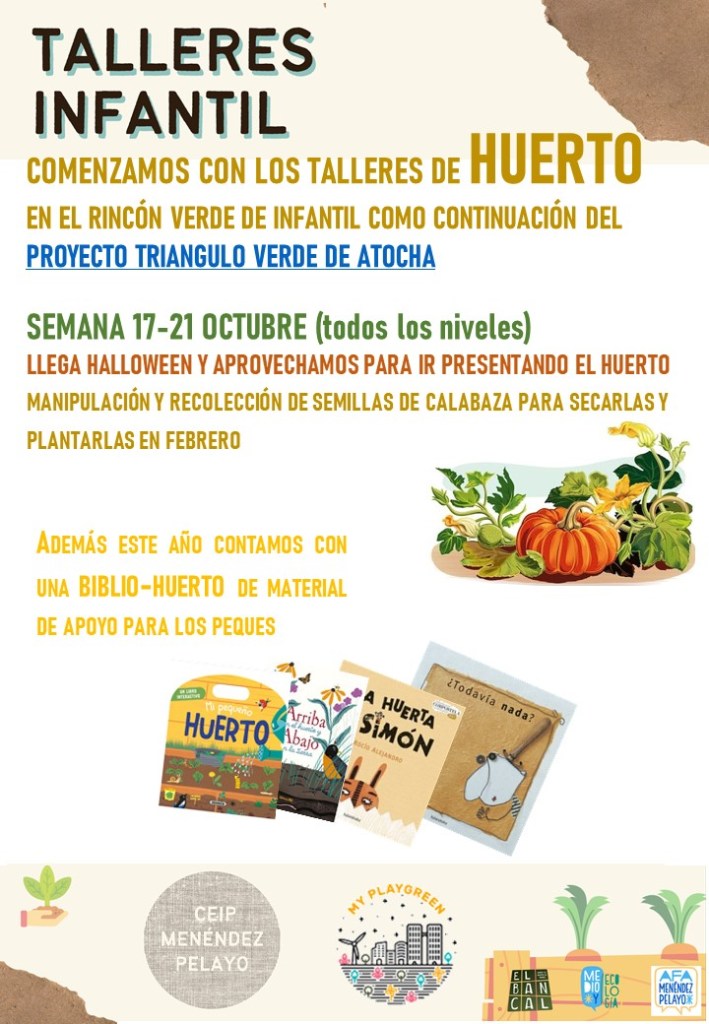 Este año, y como continuación de las actividades relacionadas con este pequeño rincón verde, el profesorado del ciclo de infantil van a comenzar esta semana con algunos talleres relacionados. Estos talleres se hacen en colaboración con la comisión de medio ambiente y ecología del AFA del colegio y la cooperativa «El Bancal» que impartirá alguno de los talleres.