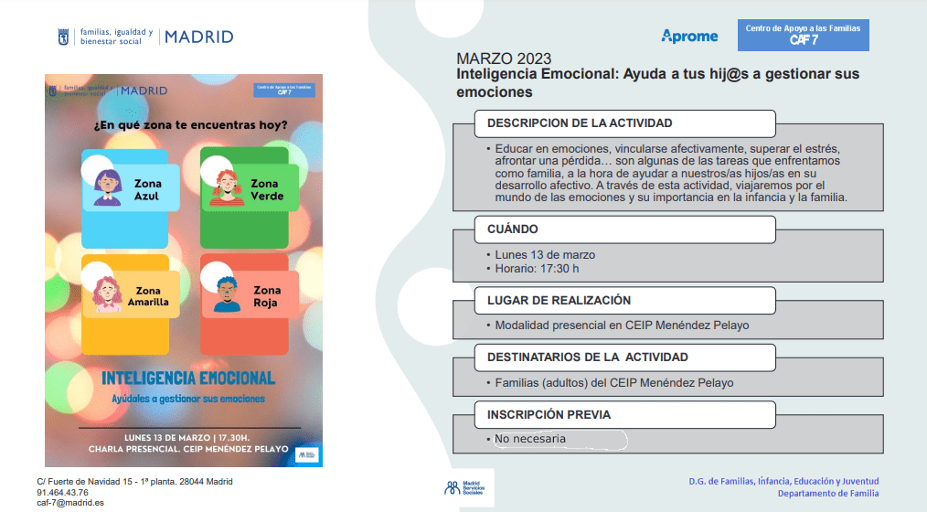 Todas las familias del Colegio Menéndez Pelayo estáis invitadas a esta interesante charla que impartirá el Centro de Apoyo a Familias de Arganzuela (CAF 7) en modalidad presencial en nuestro cole.