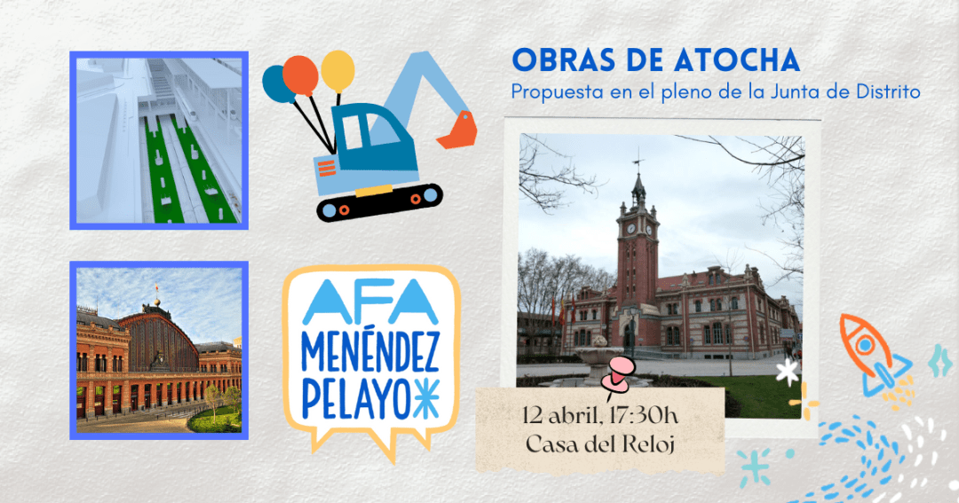Desde la AFA del Colegio Menéndez Pelayo de Madrid hemos presentado una propuesta para ser aprobada en el próximo pleno del 12 de abril de la Junta de Distrito de Arganzuela del Ayuntamiento de Madrid en relación a las inminentes obras en la estación de Atocha, por las que se verá afectado el centro. La propuesta será leída por dos representantes de la AFA en el propio pleno y, dado que es un acto público, invitamos a las familias que lo deseen a acudir a dicho pleno.