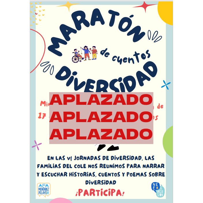 - APLAZADO Pendiente de nueva fecha en el salón de actos: os invitamos a participar en el “1er Maratón de Cuentos sobre Diversidad”. Las familias del cole (peques y adultos) nos reuniremos para narrar y escuchar historias, cuentos y poemas sobre Diversidad funcional, el tema central de las jornadas. ¡Puedes leer tu cuento y compartirlo con nosotros!