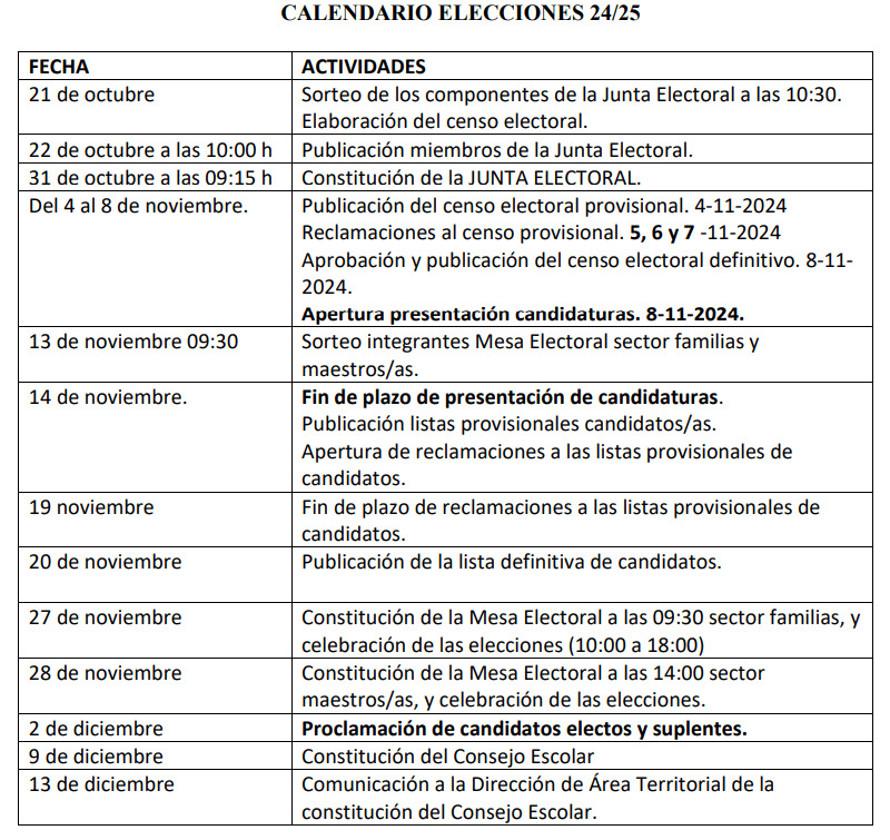 - El 2 de diciembre se produce la proclamación de candidatos/as electos/as y suplentes y el 9 de diciembre se constituye el Consejo Escolar.