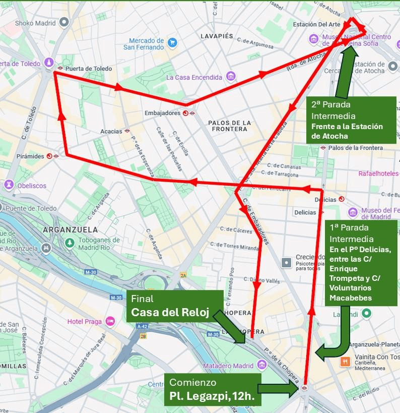 Quedaremos las familias del cole 10 minutos antes en la plaza de Legazpi, junto a la parada de Taxi, para hacer el recorrido todas juntas.
