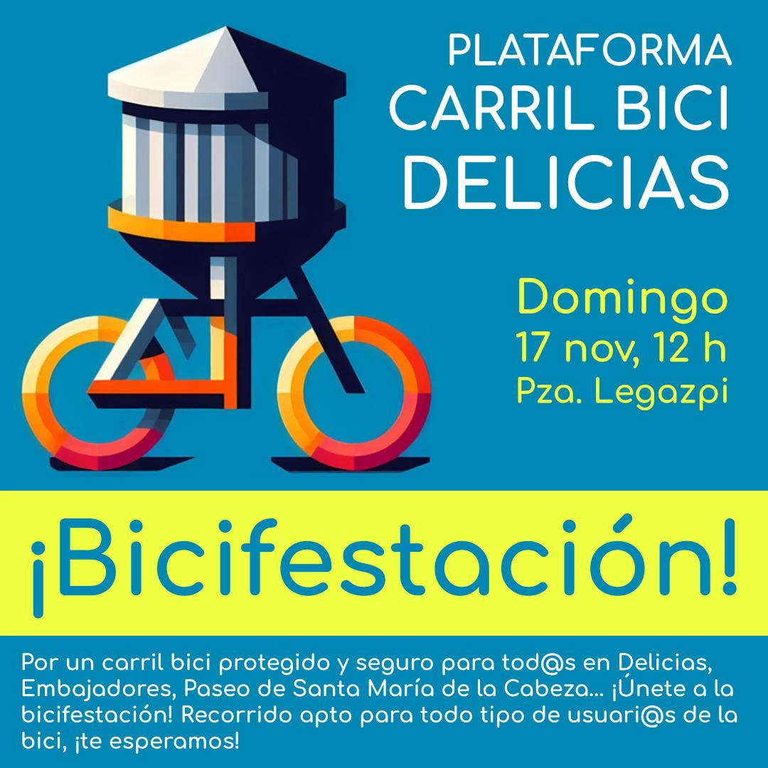 Desde la comisión de Medio y Eco de la AFA Menéndez Pelayo os animamos a participar en la BICIFESTACION del domingo 17 de noviembre a las 12h para reclamar la mejora del Carril Bici del Paseo Delicias y su conexión con otros carriles bici.