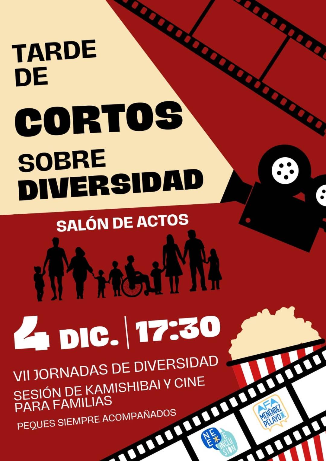 También hemos preparado una actividad abierta a todas las familias del colegio (peques siempre acompañados de un adulto). Os invitamos a participar en el “1er Ciclo de Cortos sobre Diversidad”, en el salón de actos. Será el miércoles 4 de diciembre a las 17:15 h. Incluirá la representación de un cuento con Kamishibai, y veremos cortos sobre Diversidad funcional, el tema central de las jornadas.