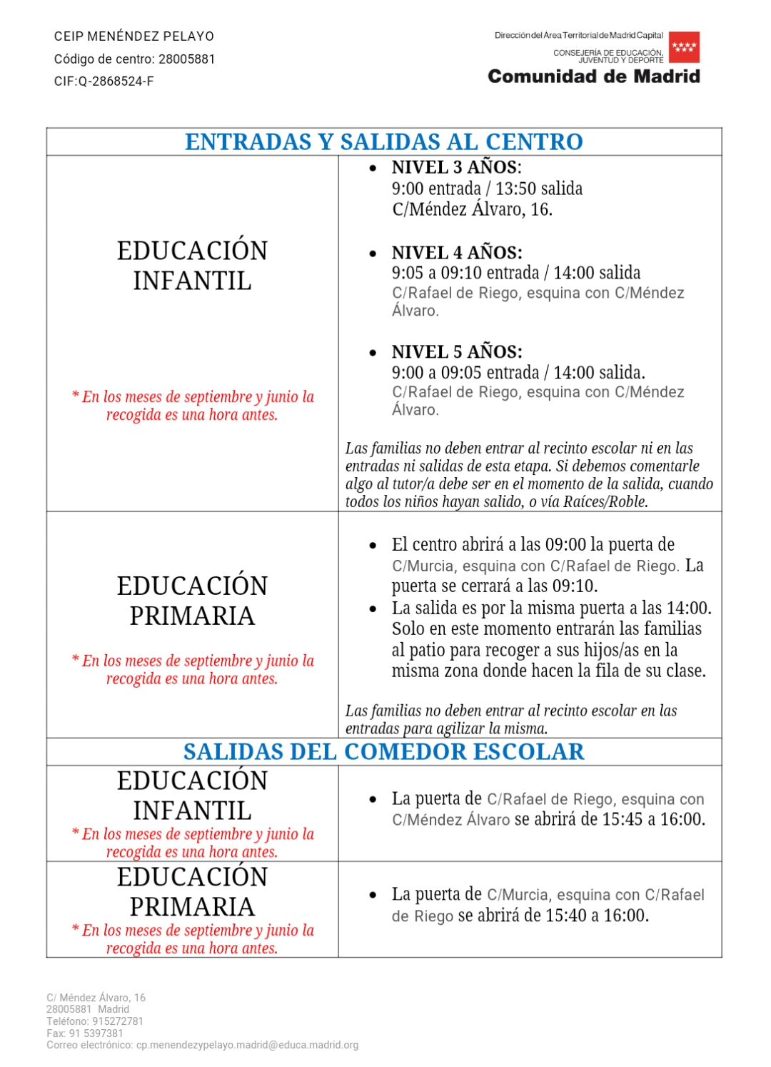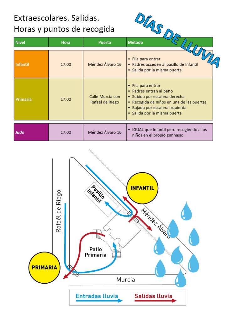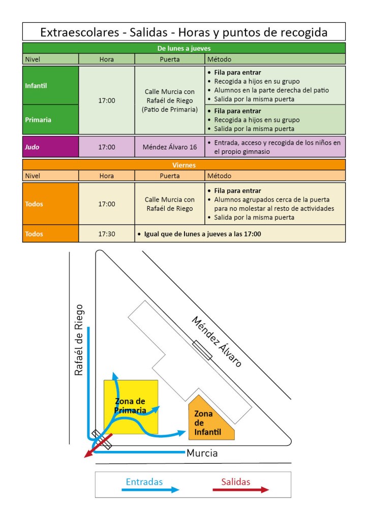 La puerta de la calle Murcia con Rafael de Riego se cerrará, como muy tarde, a las 17:10. Las familias que lleguen tarde a recoger a sus hijos deberán acceder al centro por la puerta de Méndez Álvaro 16.